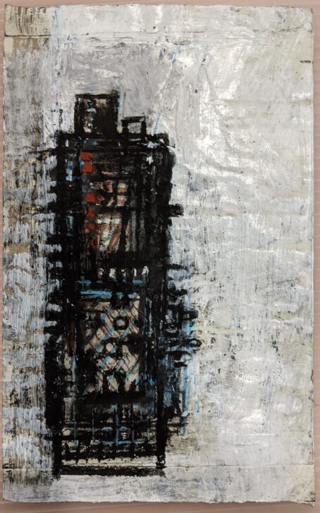 A vertically oriented rectangle, drawn with black, red, and blue lines, crosshatching, and a few small circles. There is white and grey shading in background.