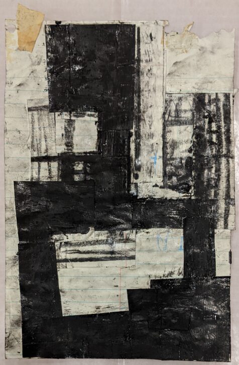 Abstract rectangles painted in black on layered notebook paper with visible blue lines.