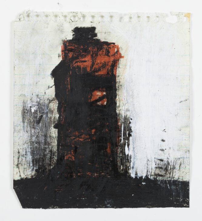 A tall, black and red rectangular structures extending upward from a black base on a white background. The piece is on a sheet of paper from a spiral binder with the cut edges of the paper still attached.