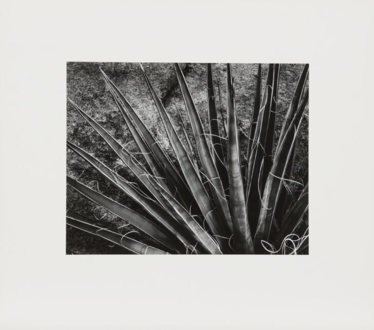 Black and white image of a plant with long, pointed leaves intertwined with a fibrous material.