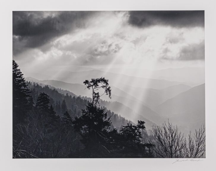 A large evergreen forest covers gently sloping mountains in dark layers at bottom left. Thin rays of sun break through clouds above sloping mountains fading into the horizon.