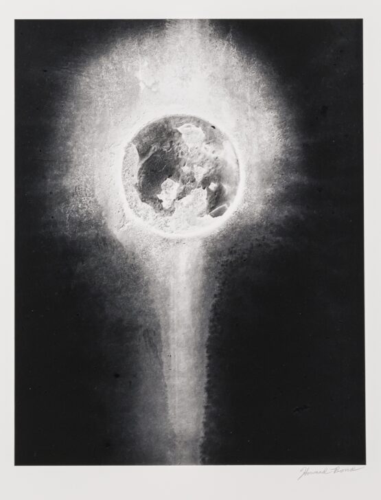 A dark circle rests in a white, expanding glow. A light point pulls upwards from the glow against a black field.