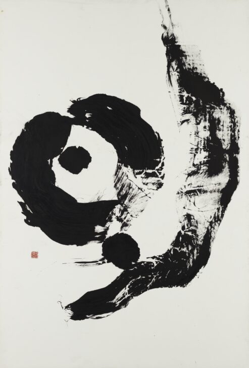 A black ink calligraphic work. On the left, is an eye-like form, with a long, fragmented line encircling its right side, seperated by a black circle.