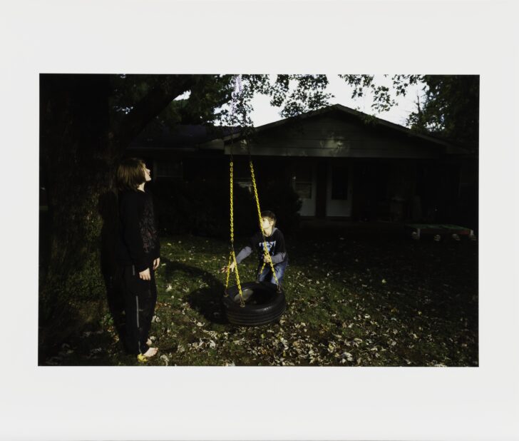 An image of two children in a front yard, both wearing dark clothing. One child holds the yellow chain of a tire swing, while the other looks upward. A dark tree and house stand in the background.