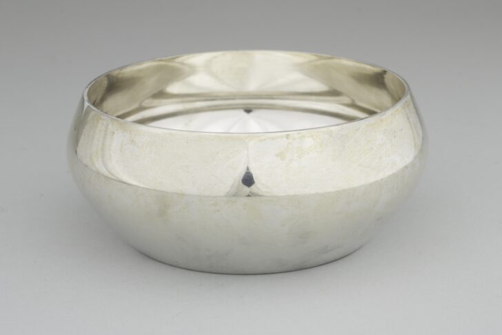 Silver bowl which is smaller at the base, widens in the center, and tapers at the top.