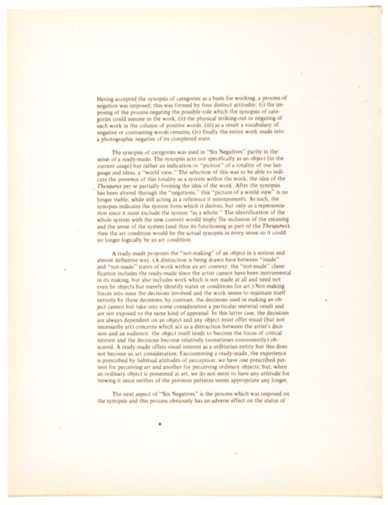 Ian Burn and Mel Ramsden were members of the loosely connected British collective Art & Language. The group, like the Conceptual Art movement of which it was a part, emerged in the late 1960s and emphasized the exploration of ideas over the creation of traditional art objects. The work produced by Art & Language was largely text-based and made frequent allusions to philosophy and linguistics. The emphasis on ideas rather than artists or objects led to the development of an aesthetic based on systems of administration. For Six Negatives, Burn and Ramsden wanted to eliminate the signs of their separate identities or individual hands and express a corporate, impersonal identity that would encourage the viewer to focus on the concepts presented. Using the organizational framework of Roget’s Thesaurus, they set out to create a six-part classification system for the examination of ideas. The resulting diagrams and text were photographically reproduced and are displayed in their negative form.