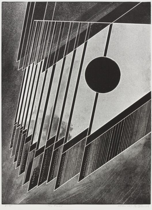A black and white image with geometric shapes crossing the page at a downward angle with a black circle with a white outline in the upper right quadrant.