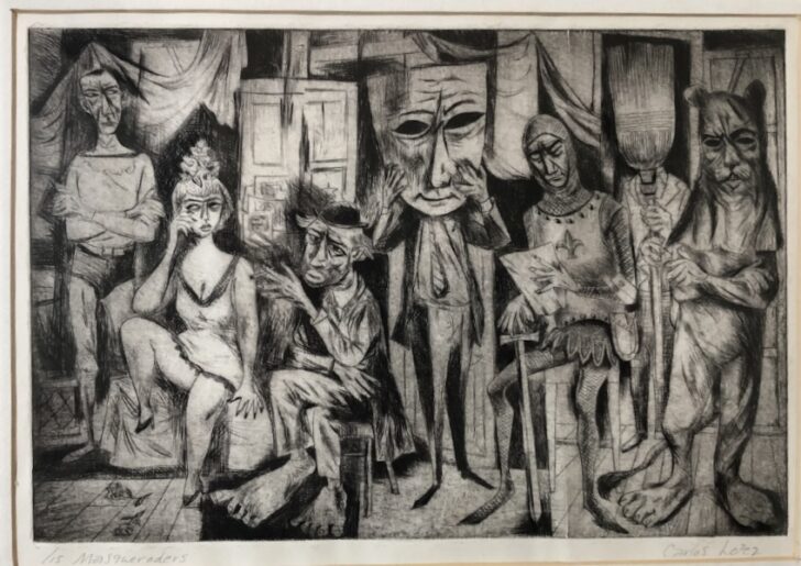 A black ink print of a group of figures in costume, including a knight, a lion, a woman wearing a headdress, a man with large feet in a bowler hat, and a person with a broom. In the center, a person in a suit and tie holds a very large mask in front of their face.