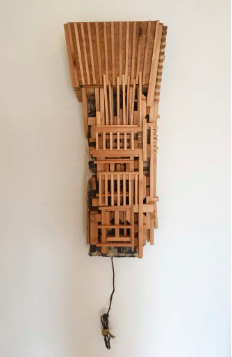 A vertical rectangular sculpture constructed of thin pieces of wood placed both vertically and horizontally in irregular sections, some overlapping. The piece widens toward the top and is covered in only vertical pieces of wood.