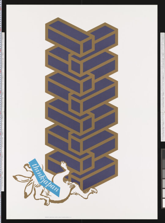 Stacked purple and gold rectangular blocks atop a gold rabbit and the text "thinkjapan" in white and blue.