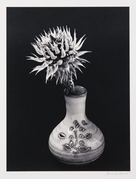 A short ceramic vase with a stylized flower design holds a fat-headed flower with several light, spiky petals.