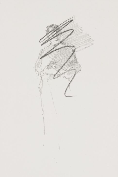 A drawn partial male figure looking to his left, detailed from the waist up with his hands in his pockets. A heavy line is drawn across the figure.