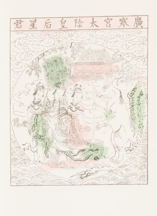 Image of three women with two of them holding feather fans looking toward a large hare. The hare is holding a stick and stiring something in a large pot or jar.