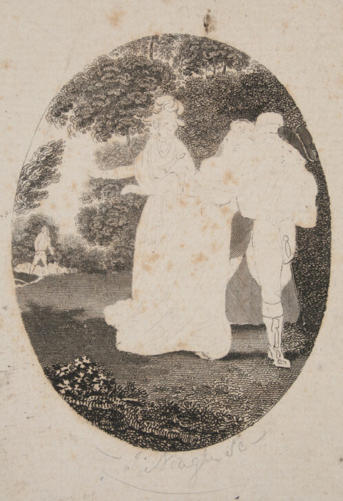 Oval format, three women next to a man in a group, one man off in the distance. Garden setting.