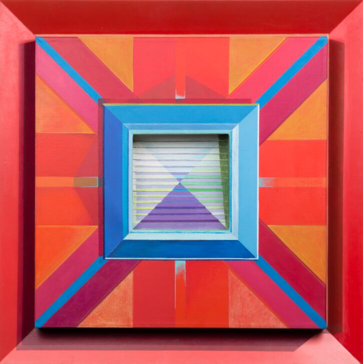 A brightly painted wood frame with an angled surface containing a canvas painted with bright geometric designs of blue, pink, orange, and red. In the center of the canvas is a wood element with the appearance of stairs painted purple, green, blue and yellow.