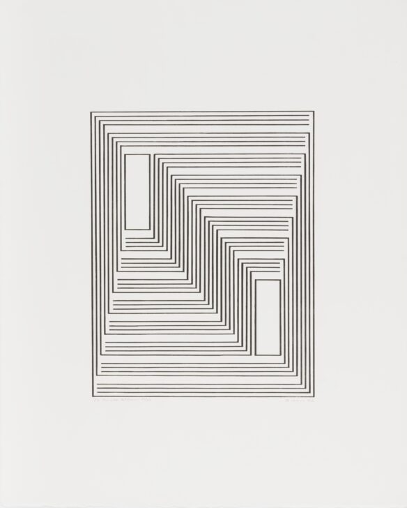These three lithographs by Josef Albers were made during his time as a faculty member at Black Mountain College, North Carolina, an important institution for the development of modernist art in the United States. Albers had previously taught at the Bauhaus school of design, architecture, and applied arts in Germany, before the Nazi takeover forced him to emigrate. At Black Mountain, he continued to teach the Bauhaus curriculum, pushing students to notice that things as varied as cigarette box labels and a handcrafted chair were designed with equal care. Such attention to the construction of things can be seen in these prints, in which simple black lines and white spaces are used to represent forms that look architectural. Though abstract, these minimal forms are reminiscent of mounds, pyramids, and shrines that Albers and his wife visited during their travels to pre-Columbian archaeological sites.