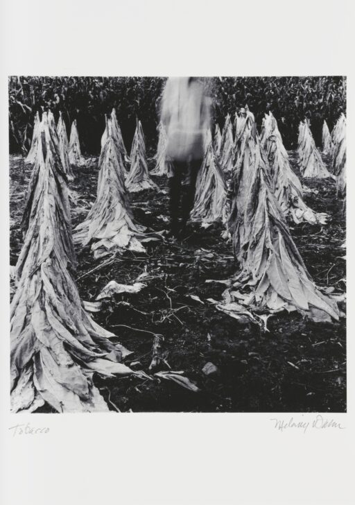 A black and white image of a figure in a tobacco field with the top half of the figure's body blurred.
