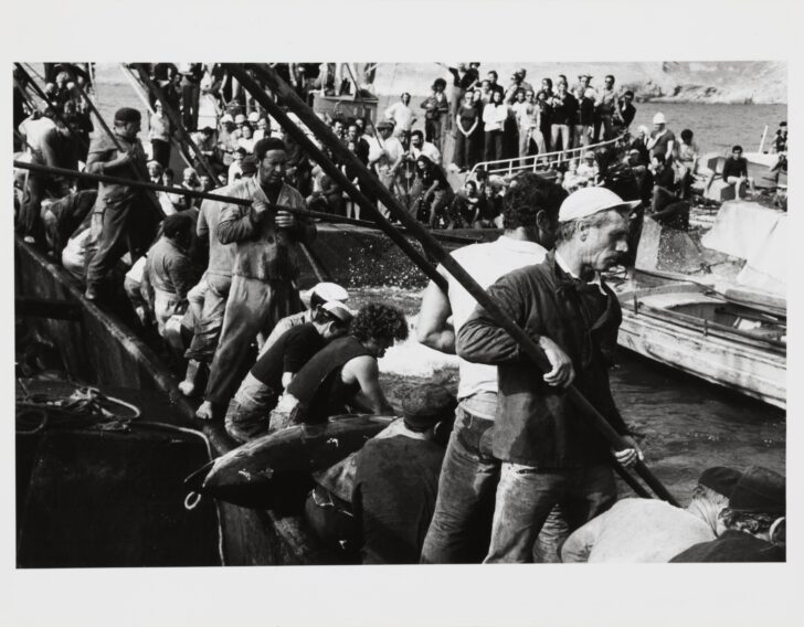 Tuna fishing with tourist in background, Egandi Islands, Sicily, Italy, 1975