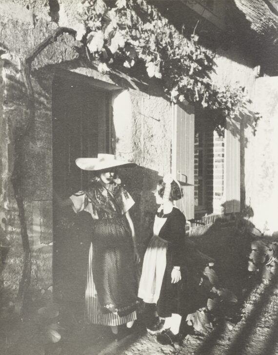 Black and white photograph of a woman and a girl in traditional clothing standing in a doorway. The woman is wearing an apron, shawl, and large hat.