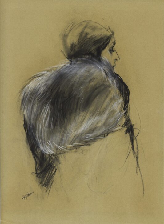 Drawing of a figure's profile. The figure's back and clothing is black and white with the appearance of fur or feathers.