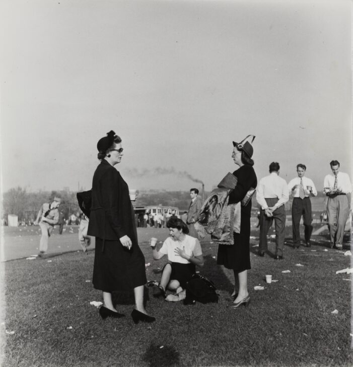 Black and white image of men and women on a field surrounded by trash on the ground. Two women in the foreground are wearing coats, hats, and carrying purses next to a woman sitting on the ground.