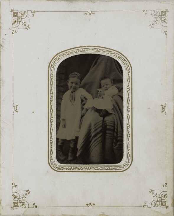 A sepia-toned image of two children and a larger, seated figure draped in a blanket. The smaller child is an infant that sits in the lap of the seated figure and the larger child stands to the infant's right with an arm on the seated figure's leg.