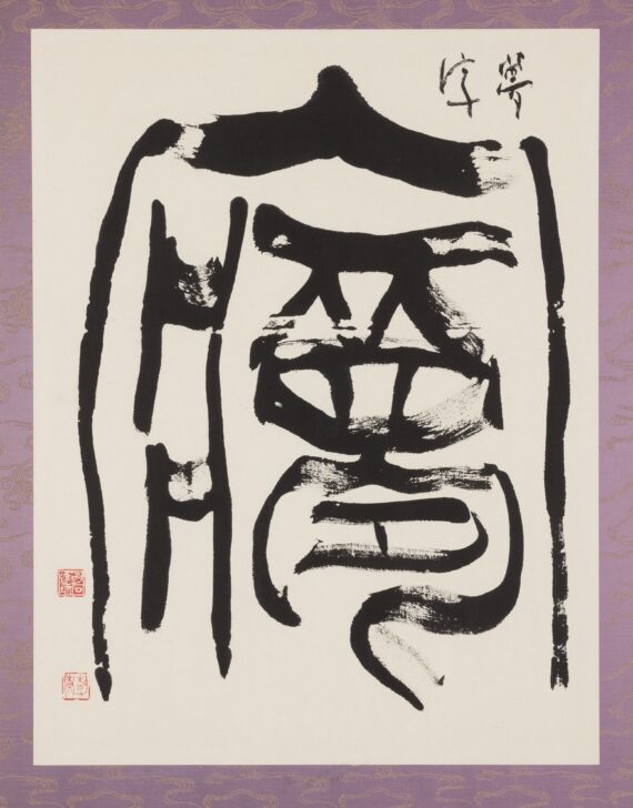 Black characters on white paper. The paper is mounted on a purple and gold fabric.