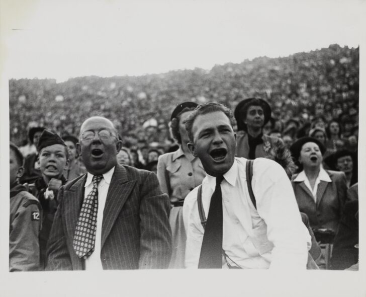 Image of a large crowd. There are two men clear in the foreground. The man on the left wears a striped suit jacket and tie. The man on the right wears suspenders and a long dark tie.