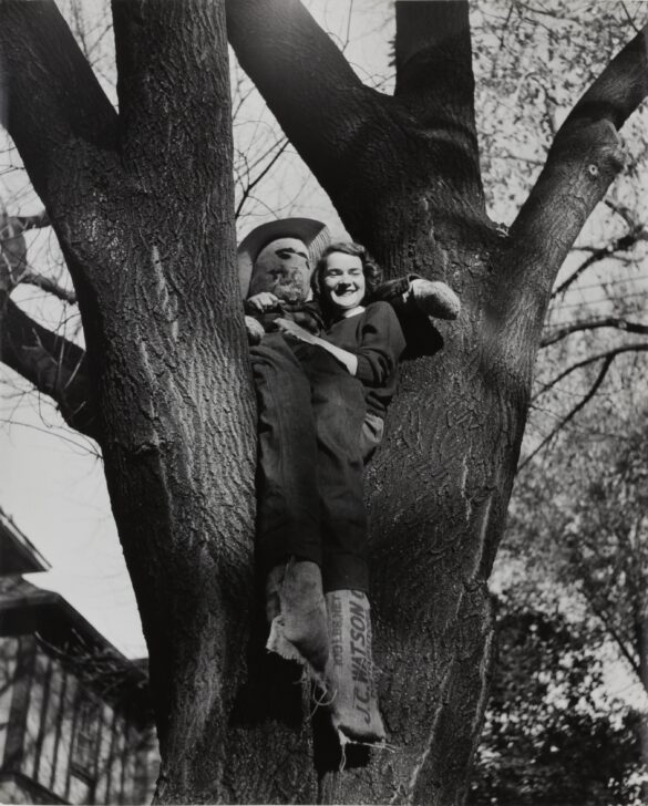 Image of a woman sitting in a tree at the point where the trunk forks. A scarecrow made of canvas sacks rests in her lap.