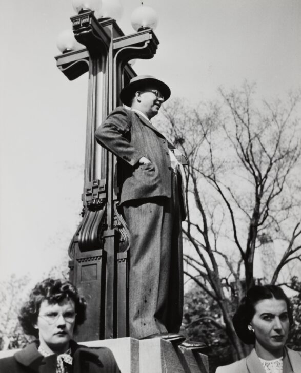 Image of a man standing on the base of a lamp post. He has his hands in his coat pockets and faces to the right of the image. Two women in the lower foreground stare out of the image.