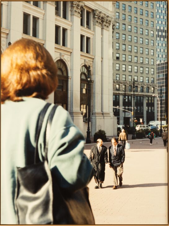 Image of a city scene, featuring a woman in the forefround with her back to the viewer. Two men in the background walk toward the viewer.