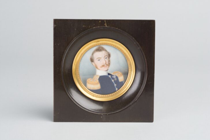 Portrait of a man with sandy blonde hair wearing a blue military uniform with a white collar and golden-fringed epaulettes. The image is mounted in a round gold frame within a black, wooden frame.