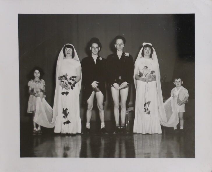 At the center of the image there are two men wearing long tuxedo jackets, top hats, and no pants. On the left and right of them are two women wearing light dresses with long veils. The women are holding bouquets and each has a small child standing behind her holding the veil train.