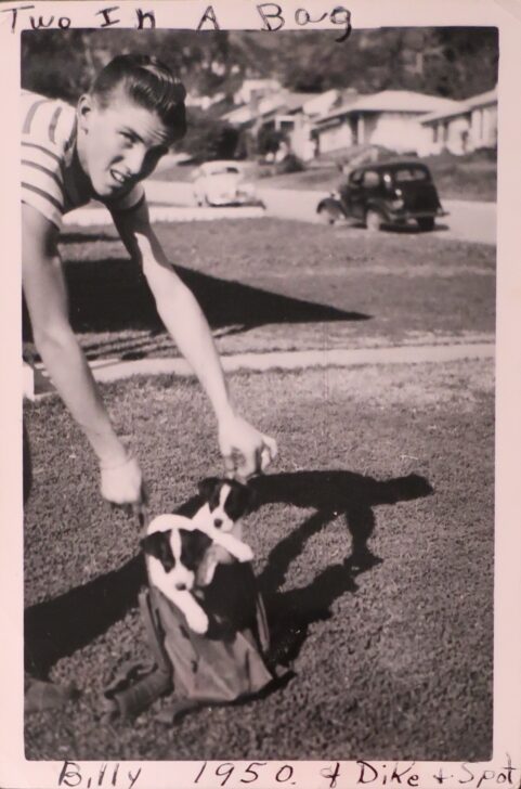 A boy in a striped shirt leans in from the left of the image, holding onto the handles of a bag that's resting on the ground. There are two puppies inside the bag. Houses and cars are visible in the background.