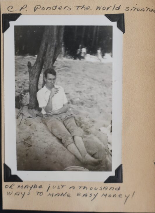 A man sitting in the sand against a tree trunk, looking down and off to the right of the image. He is barefoot with his pants rolled up to the knee. The image is stuck to a piece of paper with black photo corners and captioned both above and below with a handwritten note.