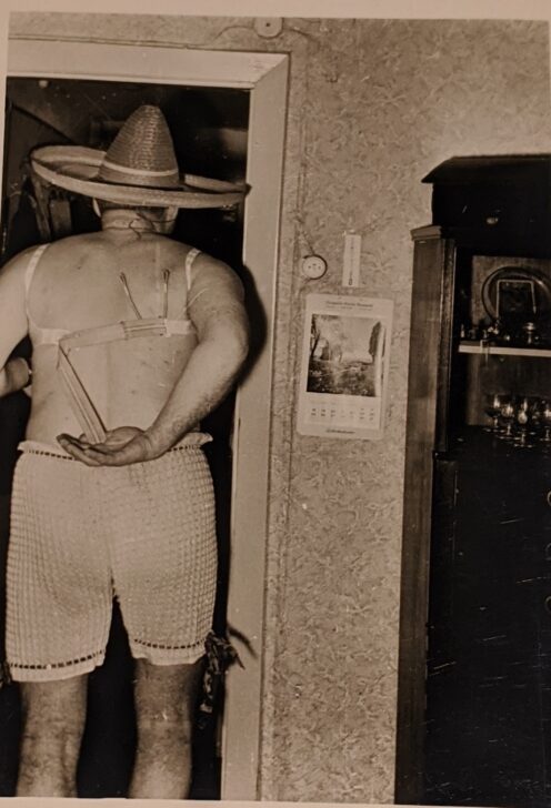 An off-center figure wearing shorts, a brassiere, and a sombrero walks under a doorframe with their back to the viewer. The figure's right arm is reaching behind their back for a strap on the brassiere.