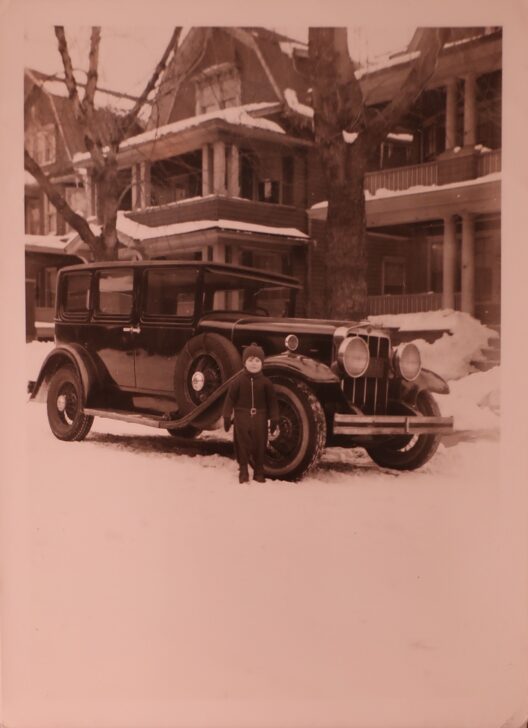 A small child wearing a cap and mittens stands on a snowy street in front of what appears to be a touring car from the early 1900s. The car is dark-colored and has large round headlights. There is a large house in the background.