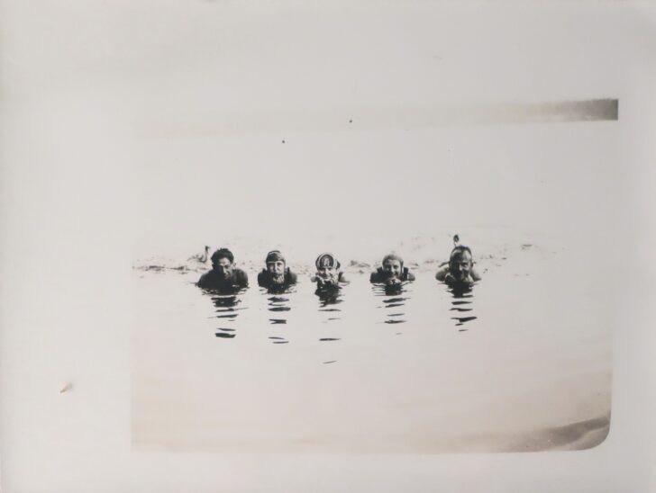 Five smiling people lined up in a body of water with just their heads and hands visible above the surface. The horizon is faintly visible towards the top right of the image.