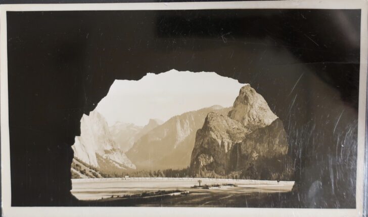 A mountainous landscape viewed through the craggy, semicircular opening of a tunnel.