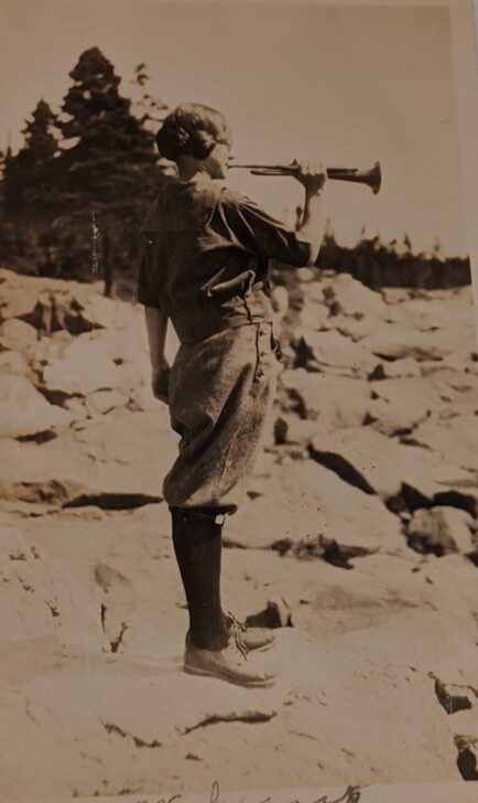 A woman wearing early-20th century athletic clothing stands in a rocky area while playing a bugle or trumpet. In the background behind the woman is a thick forest of trees.