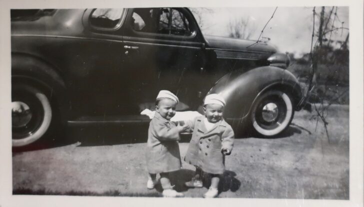 Two toddler-aged children in matching coats and hats, standing in front of an old-fashioned car. The child on the right appears to be holding on to the child on the left. Both are looking off to the right of the image.