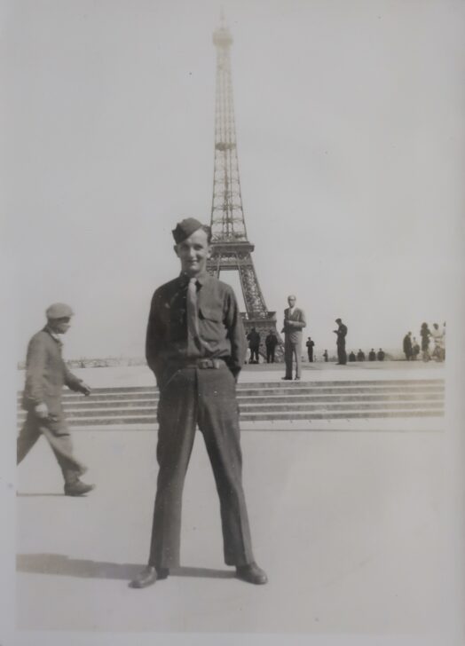 A young man in military uniform standing in front of the Eiffel Tower. He poses with his feet apart and his hands behind his back, smiling at the camera.