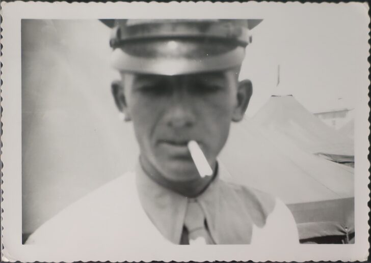 A close-up, softly-focused image of a man wearing a military cap and smoking a cigarette. The cigarette is very bright white and centered in the image. There is what appears to be a row of tents in the background.