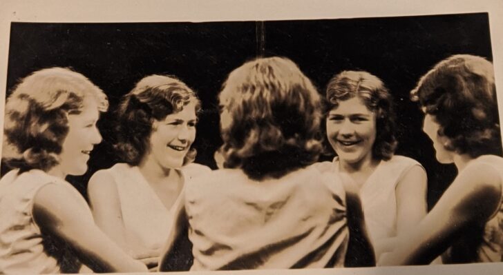 Five young women in matching white blouses sit in a circle, smiling. The woman in the foreground has her back to the camera.