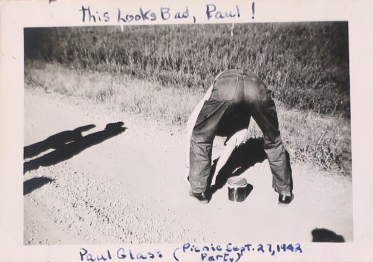 A man bent over at the waist on the edge of a dirt road, photographed from behind. There is a small can between his feet and the shadows of two other people on the left side of the image. There is a handwritten caption above the image that reads, “this Looks Bad, Paul!”