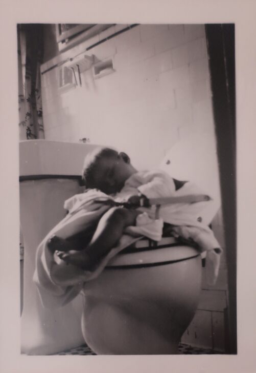 A small child sleeping in a chair on what appears to be the lid of a toilet. The child has blankets around them and is leaning over to the left. There is white tile and a wall-mounted toothbrush holder visible in the background.