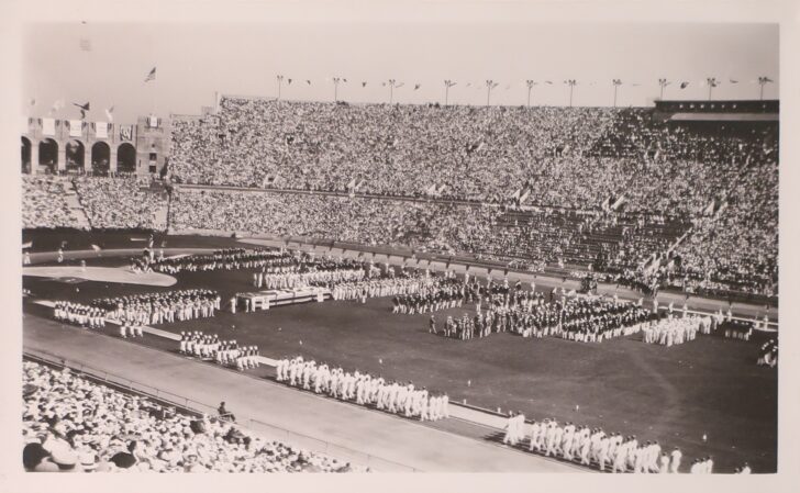 What appears to be a large open-air sports arena or field photographed from high up. The stands are quite full and there are many people in uniforms walking and standing in formation on the field.
