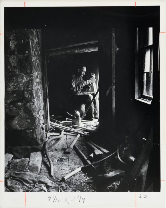 An old man with a mustache sits in a room with stone walls. He sits surrounded by wooden boards and poles, holding an axe and facing a light source not visible to the viewer.