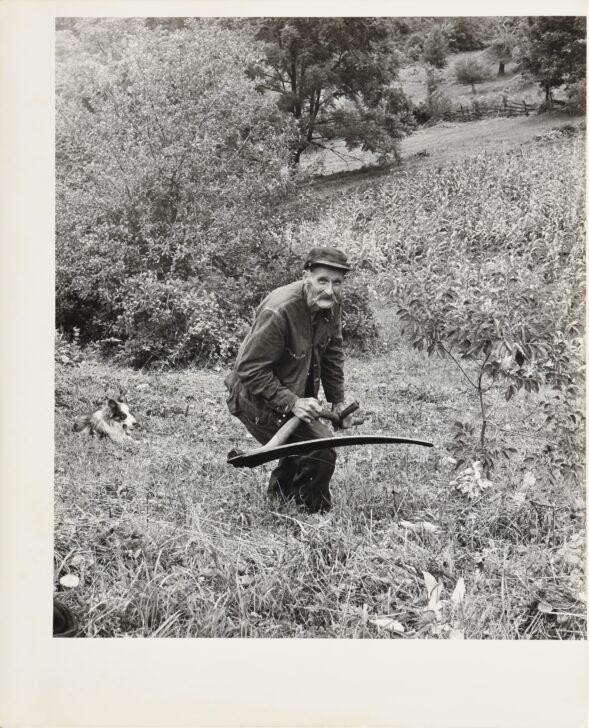 An old man stands on a hill holding a large scythe with a wooden handle and curved metal cutting portion. A dog watches the man's progress from the background.