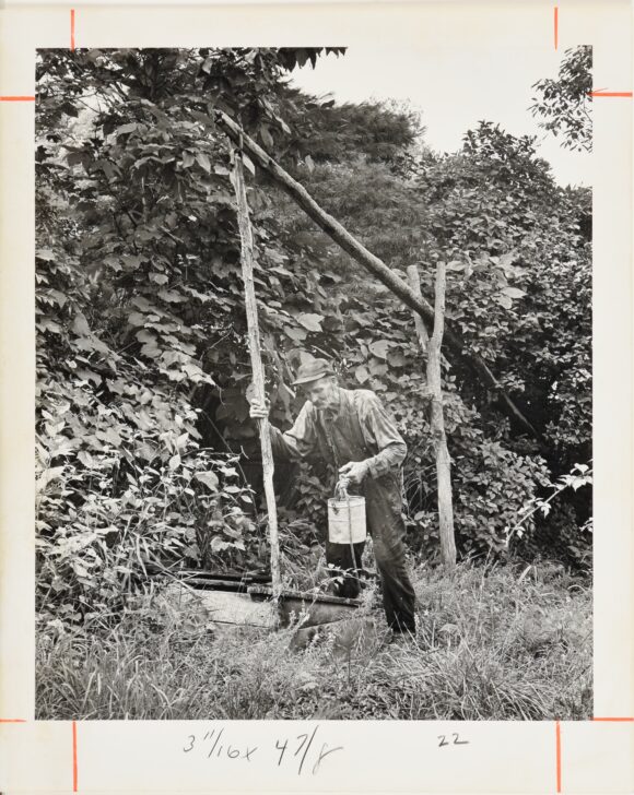 An old man holds a bucket while looking into a well with a wooden pulley system.